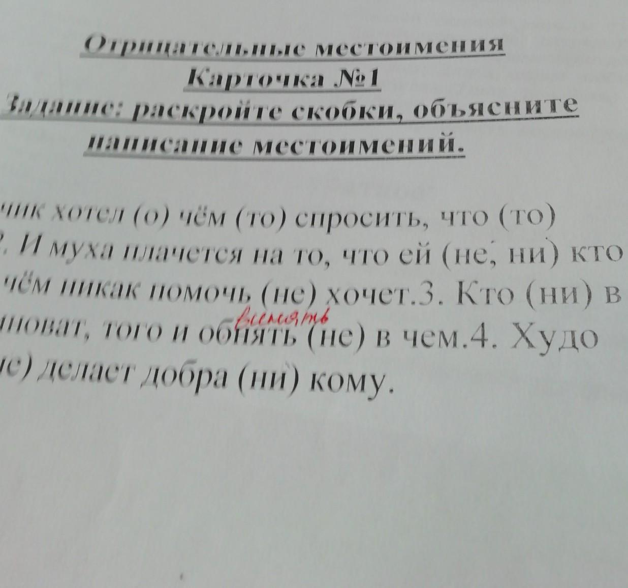 1 Мальчик хотел (о) чём (то) спросить, что (то) сказать. 2.И муха плачется на то, что ей (не, ни) кто (не, ни) в чем никак помочь (не) хочет. 3.Кто (ни) в чем (не) виноват, того и обвинять (не) в чем. 4.Худо тому, кто (не) делает добра (ни) кому