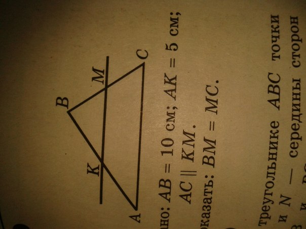 А точка,что проходит через середину стороны треугольника и параллельна основанию-это средняя линия треугольника, а значит и т. М середина ВС и тогда ВМ=МС