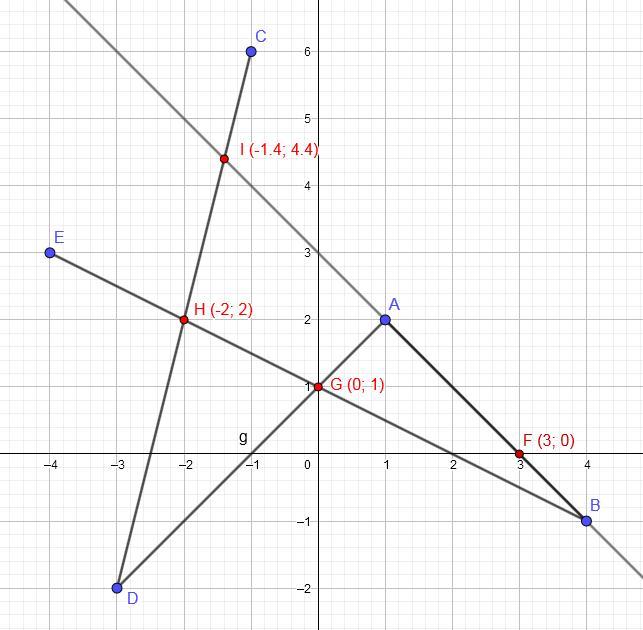В координатной плоскости отметьте точки A(1;2) , B(4;-1) , C(-1;6) , D(-3;-2) , E (-4;3).Найдите а)координаты точки пересечения отрезка АВ с осью абцисс; b)координаты точки пересечения отрезка АD с осью ординат; С) координаты точки пересечения отрезков ВЕ и СD; d)координаты точки пересечения отрезка СD и прямой АВ помогите!!!!