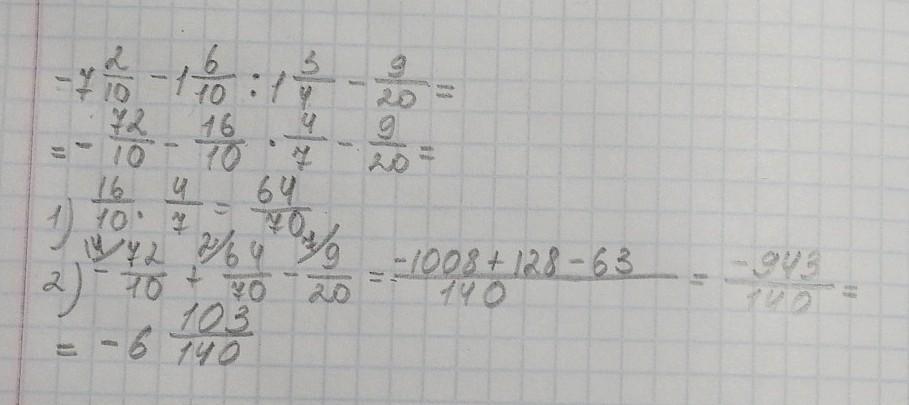 Минус семь целых две десятых минус одна целая шесть десятых разделить на одну целую три четвёртых минус девять двадцатых =