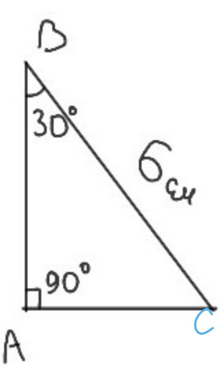 Начнём с катета АС: Так как угол В=30, катет, противолежащий углу в 30 градусов равен половине гипотенузы. Значит АС=6:2=3 см