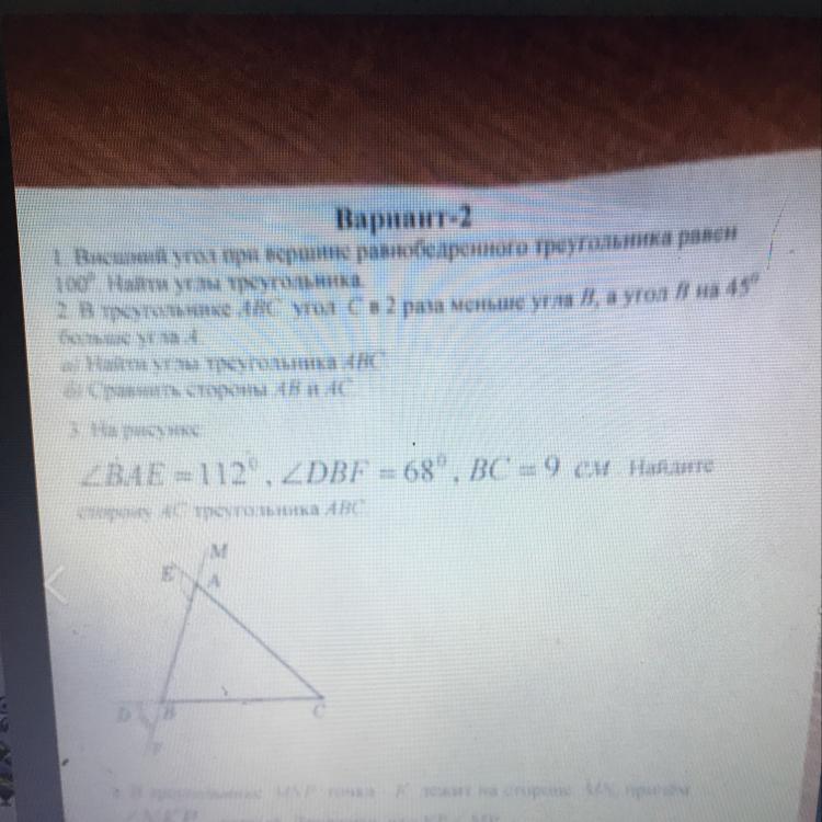 ∠B = 90°; ∠A = 45°; ∠C = 45° ⇒ ΔABC - прямоугольный, равнобедренный, AC - гипотенуза, AB = BC - катеты.