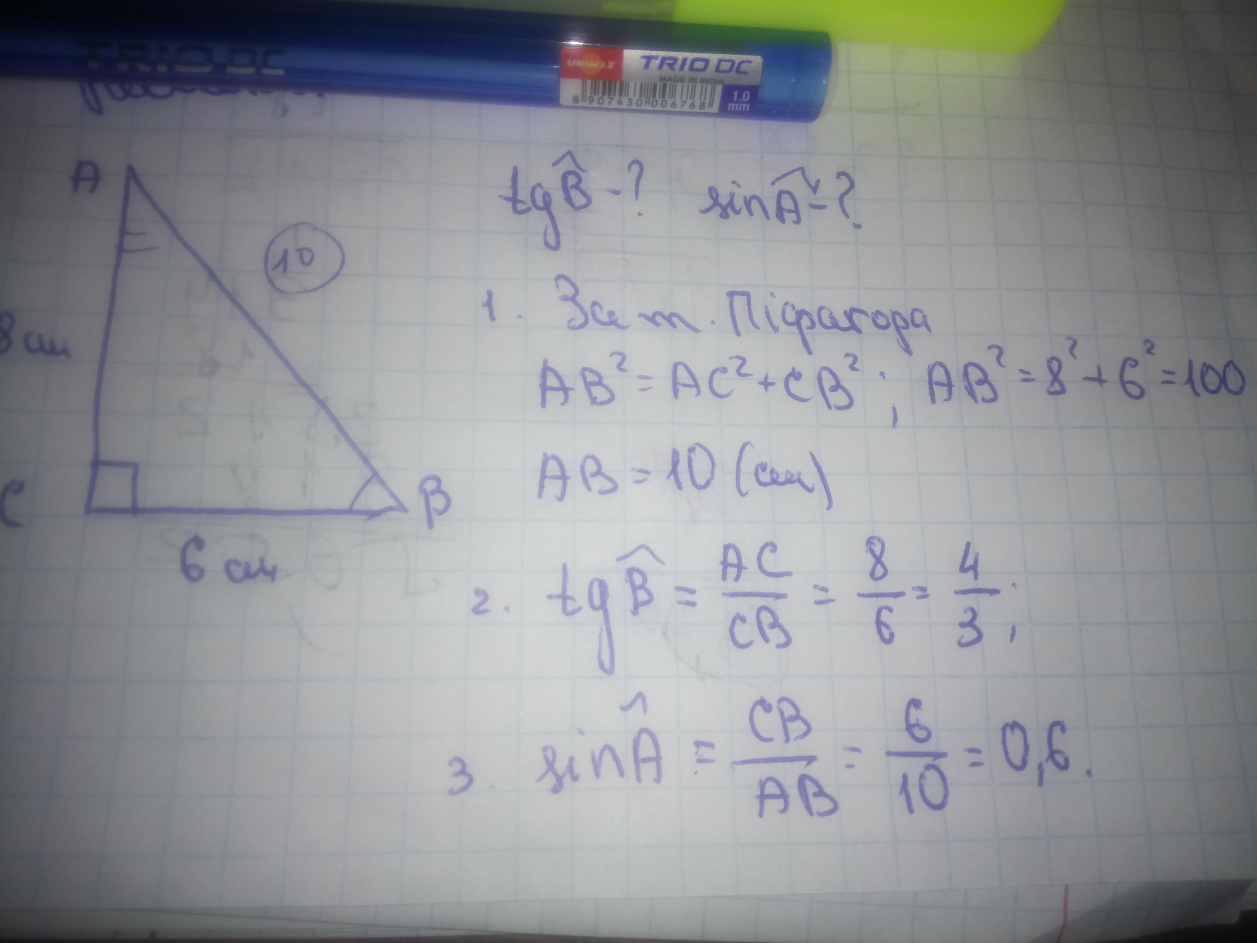 У трикутнику ABC, кут C=90°, AC=8см, BC=6 см