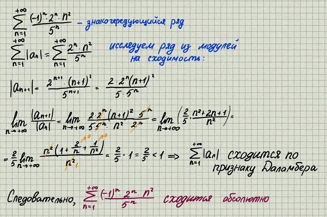 Так как 2/5 < 1, то по признаку Даламбера ряд из модулей СХОДИТСЯ, а сам ряд сходится абсолютно. (и признак Лейбница не нужен).
