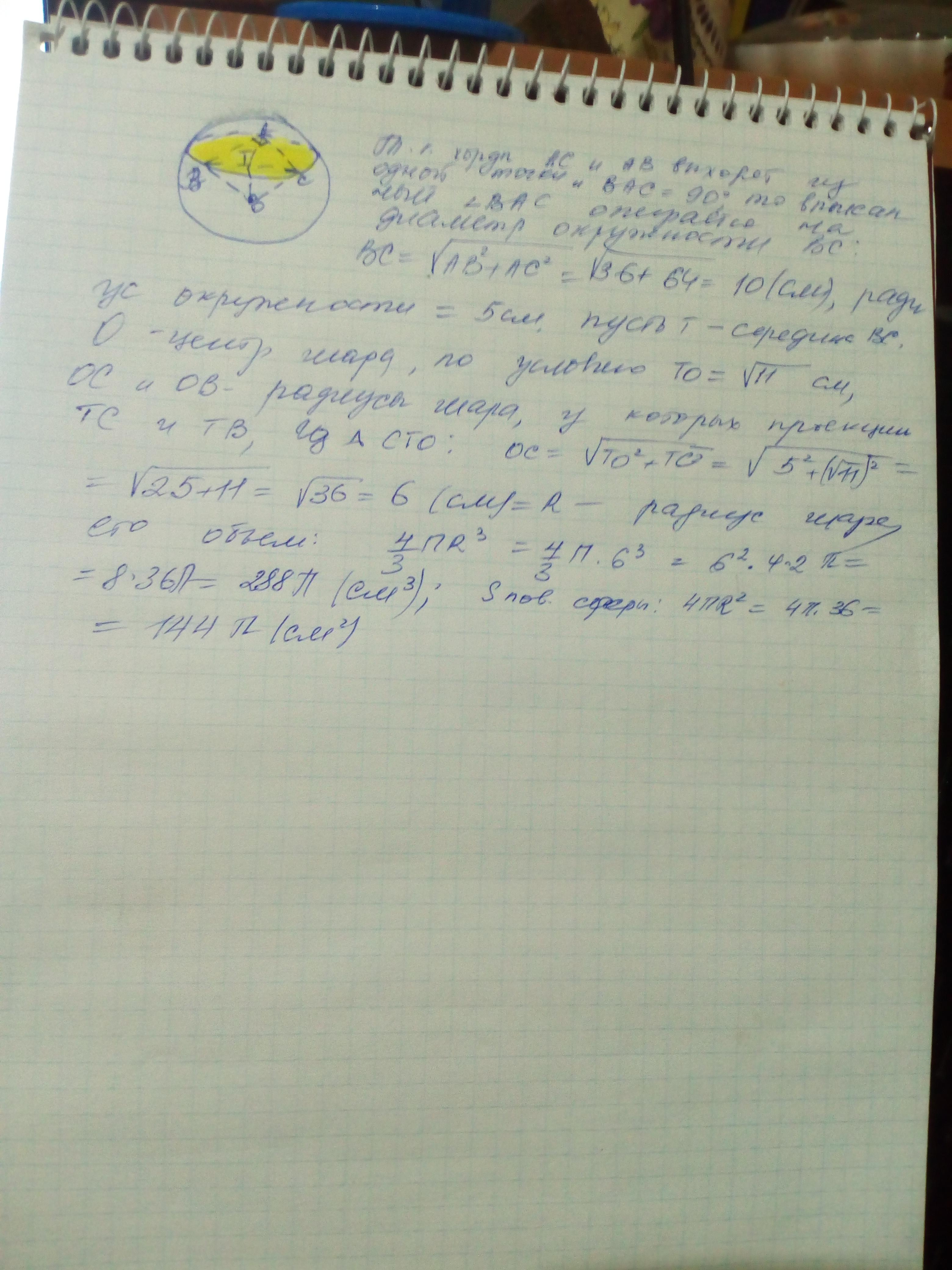 В шаре проведены две взаимно перпендикулярные хорды АВ = 6 см и АС = 8 см. Найдите объем шара и площадь его поверхности, если прямая ВС удалена от центра шара на √11 см.