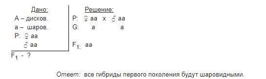 У тыквы дисковидная форма плода доминирует над шаровидной. Гомозиготную шаровидную тыкву опылили пыльцой такой же тыквы. Какими будут гибриды первого поколения?
