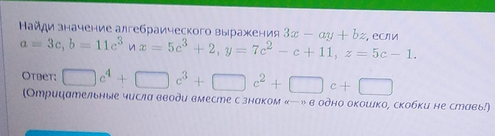 3x-ay+bz при: а=3с; b=11c³; x=5c³+2; y=7c²-c+11; z=5c-1