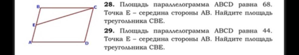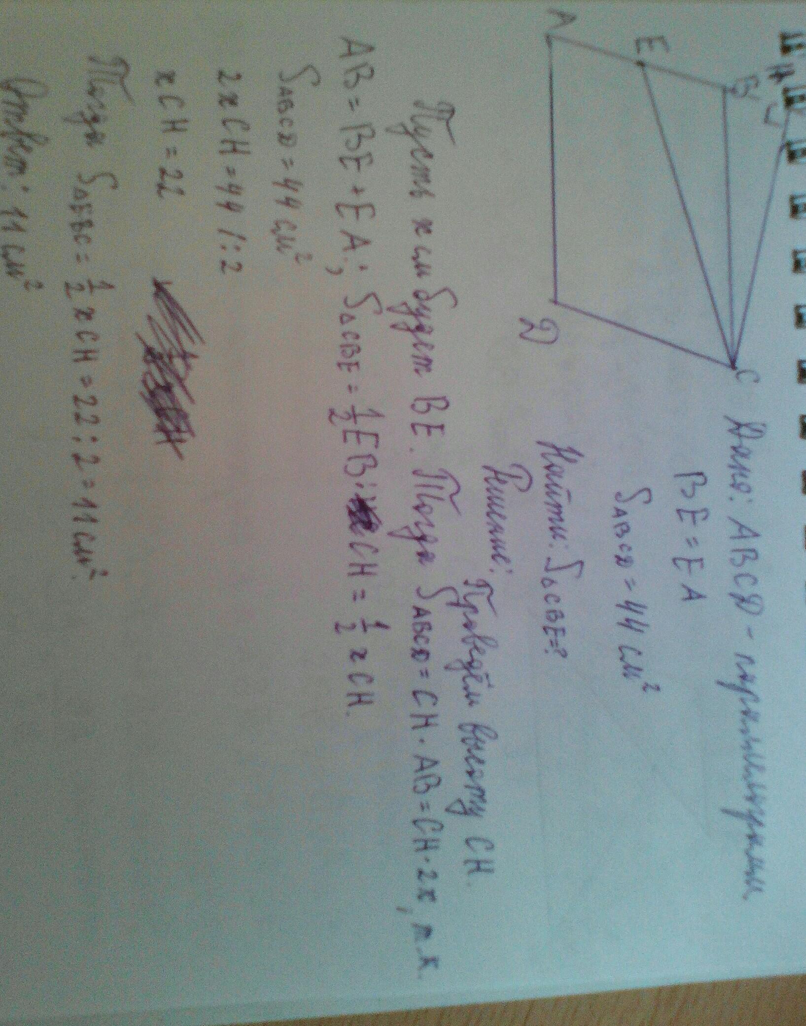 Если мы проведем среднюю линию в параллелограмме из точки E, то получим параллелограмм в 2 раза меньший данному, значит площадь нового полученного будет равна 22, а диагональ делит любую фигуру пополам ⇒ SΔABC=11