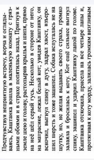/Предчувствуя неприятную встречу, ворча и оглядываясь/, Каштанка вошла в маленькую комнату с грязными обоями и в страхе попятилась назад. /Пригнув к земле шею и голову, растопырив крылья и шипя/, прямо на неё шёл серый гусь. Несколько в стороне от него, на матрасике, лежал белый кот; /увидев Каштанку/, он вскочил, выгнул спину в дугу, задрал хвост, взъерошил шерсть и тоже зашипел. Собака испугалась не на шутку, но, /не желая выдавать своего страха/, громко залаяла и бросилась к коту. Кот ещё сильнее выгнул спину, зашипел и ударил Каштанку лапой по голове. Каштанка отскочила, присела на все четыре лапы и, /протягивая к коту морду/, залилась громким визгливым лаем.