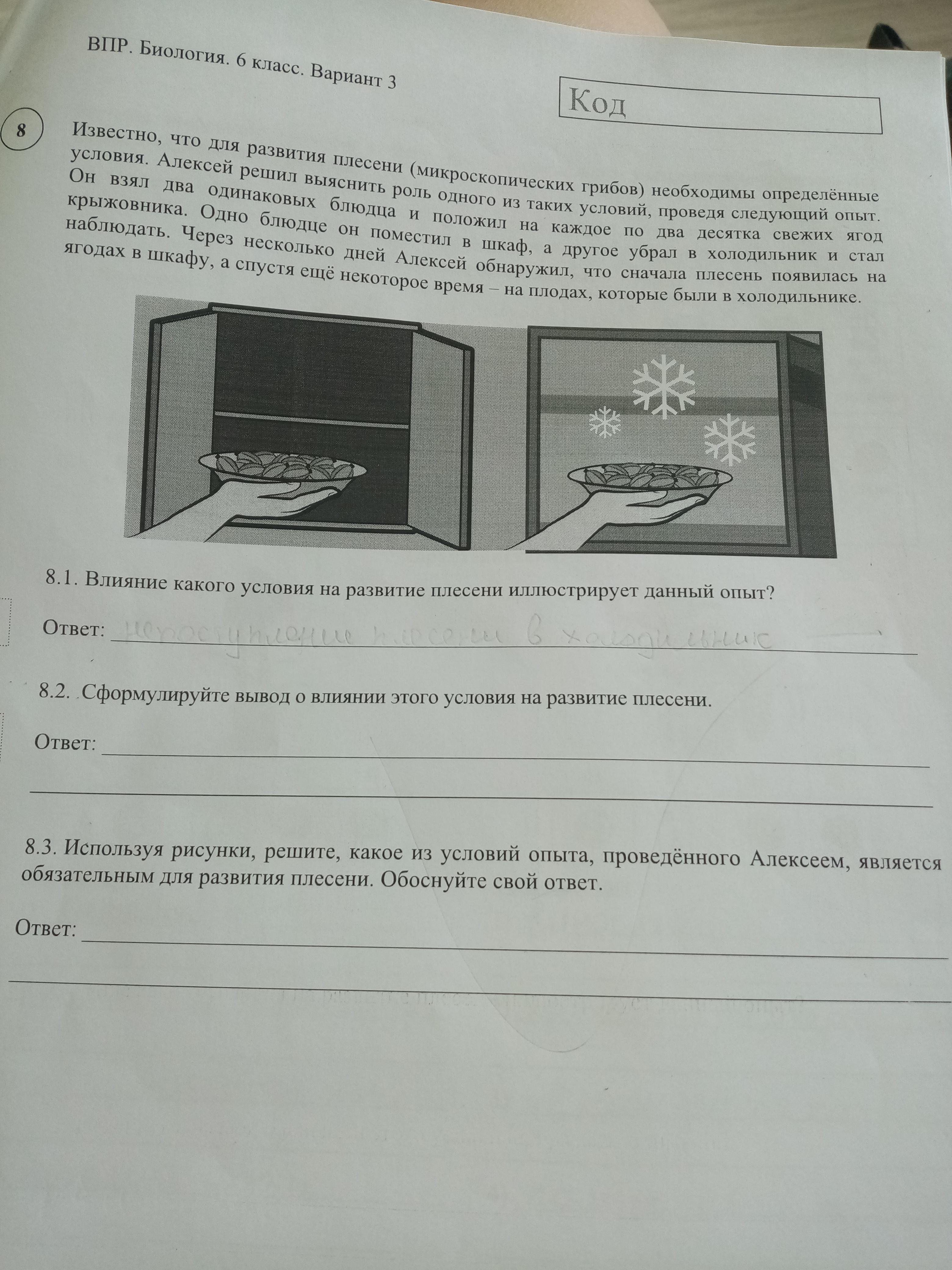 8.2. в тепле есть благоприятные условия для роста и размножения плесени. А холод способствует замедлению данных процессов. плесень всё же есть, но в холоде она появляется и развивается меньше.