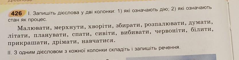 426 . Запишіть дієслова у дві колонки: 1) які означають дію; 2) Які означають