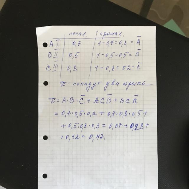 P(два попадания) = P₁₂ + P₁₃ + P₂₃ = 0,07 + 0,28 + 0,12 = 0,47