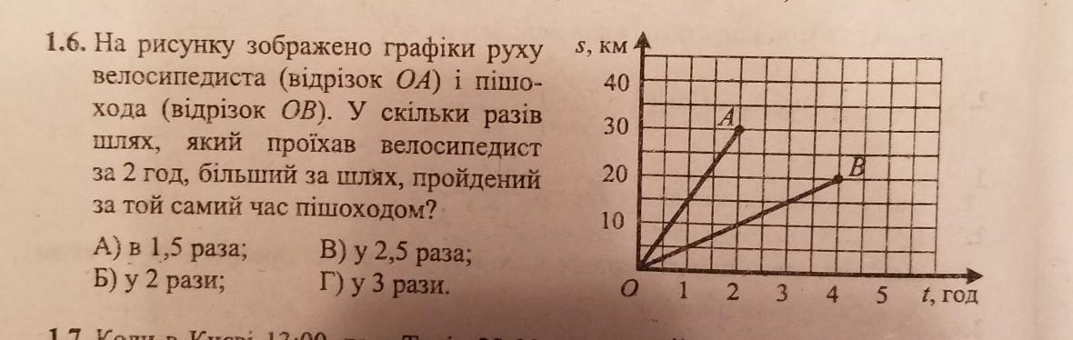 на рисунку зображено графіки руху велосипедиста (відрізок AO) і пішохода(відрізок OB). у скільки разів шлях, який проїхав велосипедист за 2 години, більший за шлях, пройдений за той самий час пішоходом?
