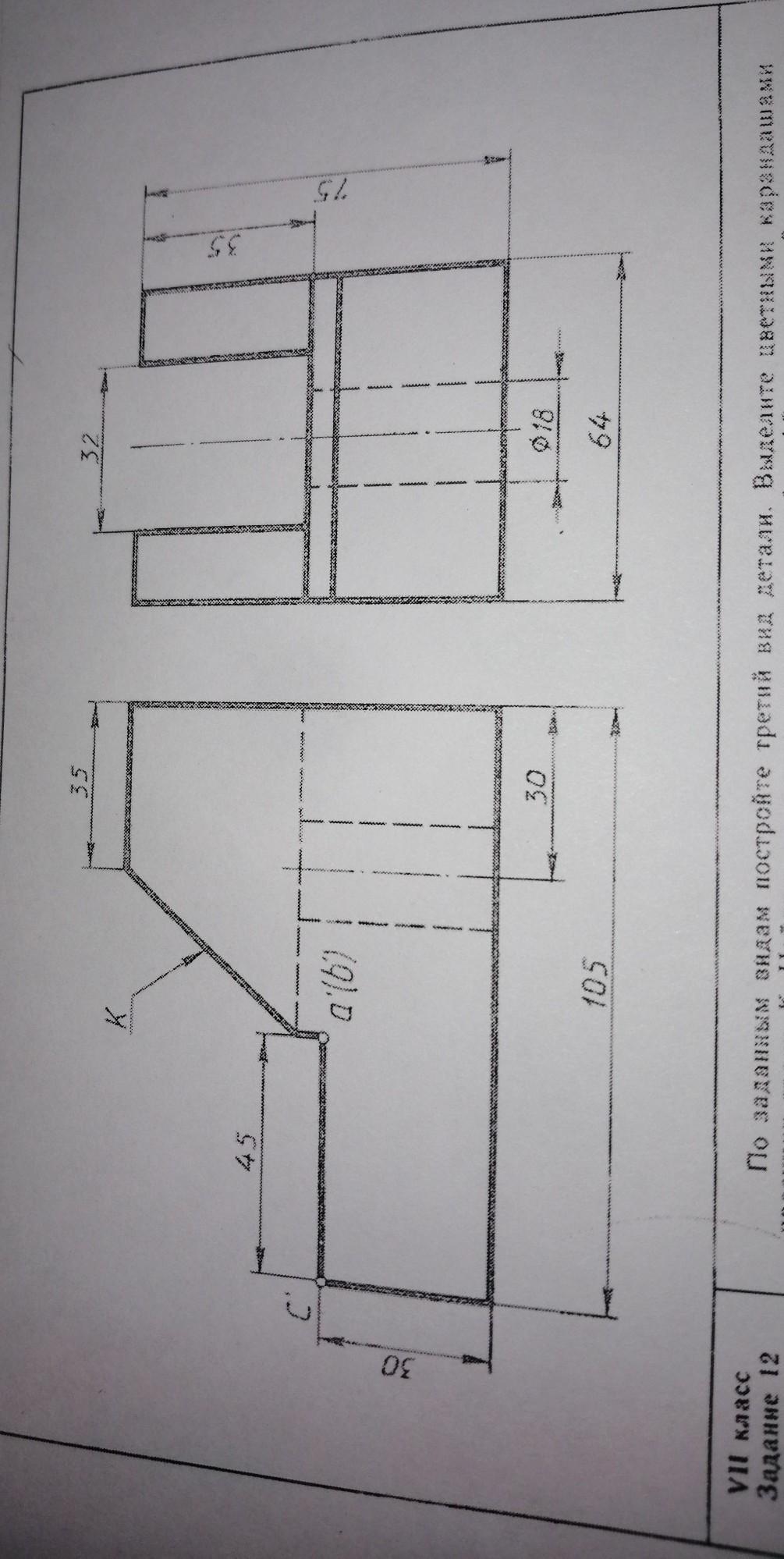 Помогите пожалуйста. По заданным видам постройте третий вид детали. Выделите цветными карандашами проекции грани к. Найдите на всех видах проекции ребра АВ и вершины С. Даю 35 баллов.