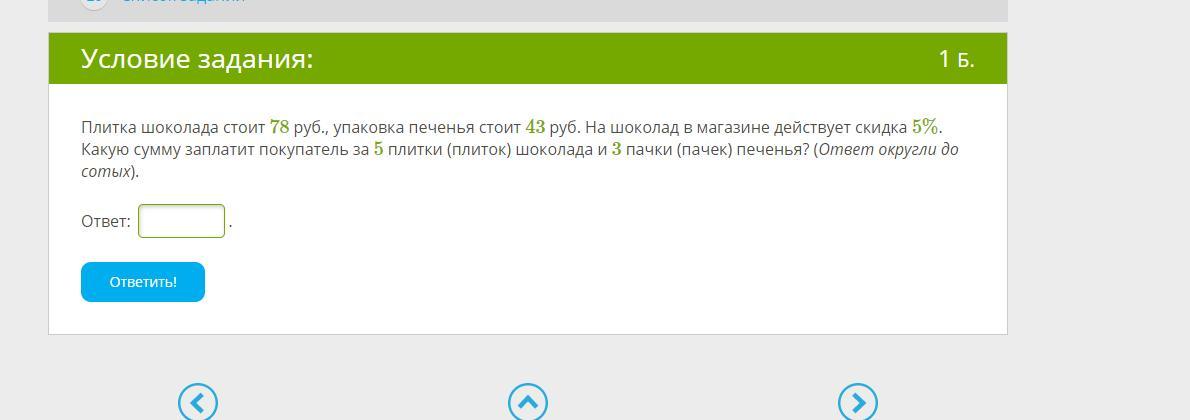 Плитка шоколада стоит 78 руб., упаковка печенья стоит 43 руб. На шоколад в магазине действует скидка 5%. Какую сумму заплатит покупатель за 5 плитки (плиток) шоколада и 3 пачки (пачек) печенья? (Ответ округли до сотых).