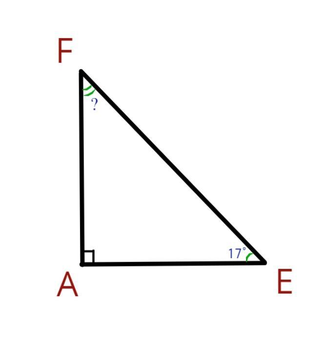 Дан прямоугольный треугольник AEF. E A F Определи ∡ F, если ∡ E = 17°.Дан прямоугольный треугольник AEF. E A F Определи ∡ F, если ∡ E = 17°.