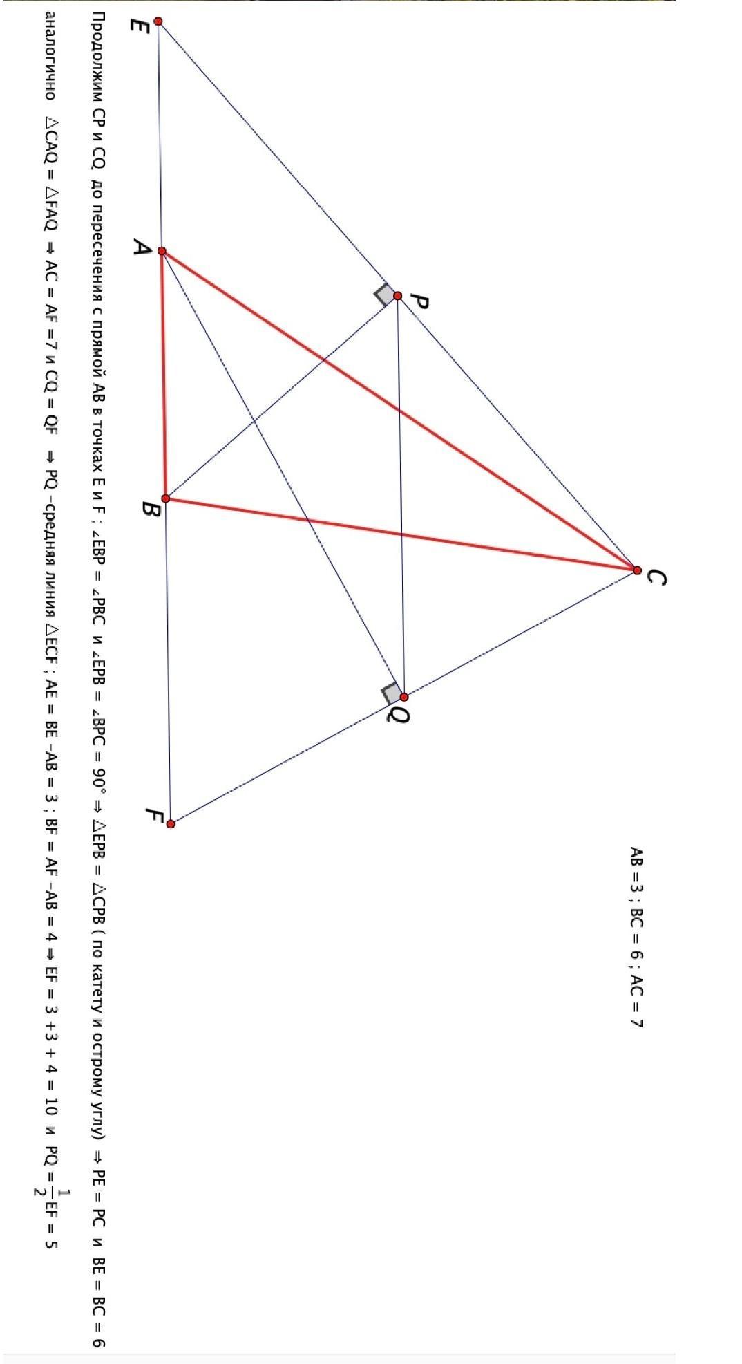 В треугольнике ABC проведены биссектрисы углов A и B. Из вершины С к этим биссектрисам проведены перпендикуляры CP и CQ. Найдите PQ, если AB=3, BC=6, AC=7.