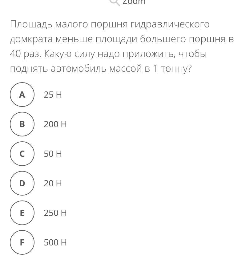 Площадь малого поршня гидравлического домкрата меньше площади большего поршня в 40 раз. Какую силу надо приложить, чтобы поднять автомобиль массой в 1 тонну?