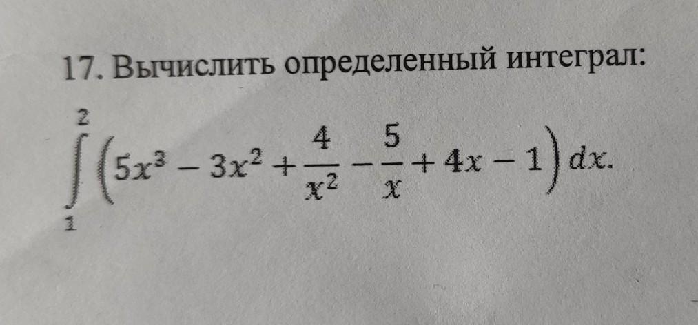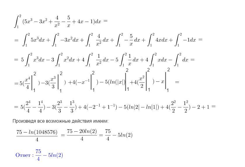 F(b) -F(a) = (5/4)*(2⁴ -1⁴) -(2³ -1³) - 4(1/2 -1/1) -5(ln2 -ln1)+2*(2² -1²) -(2-1) =