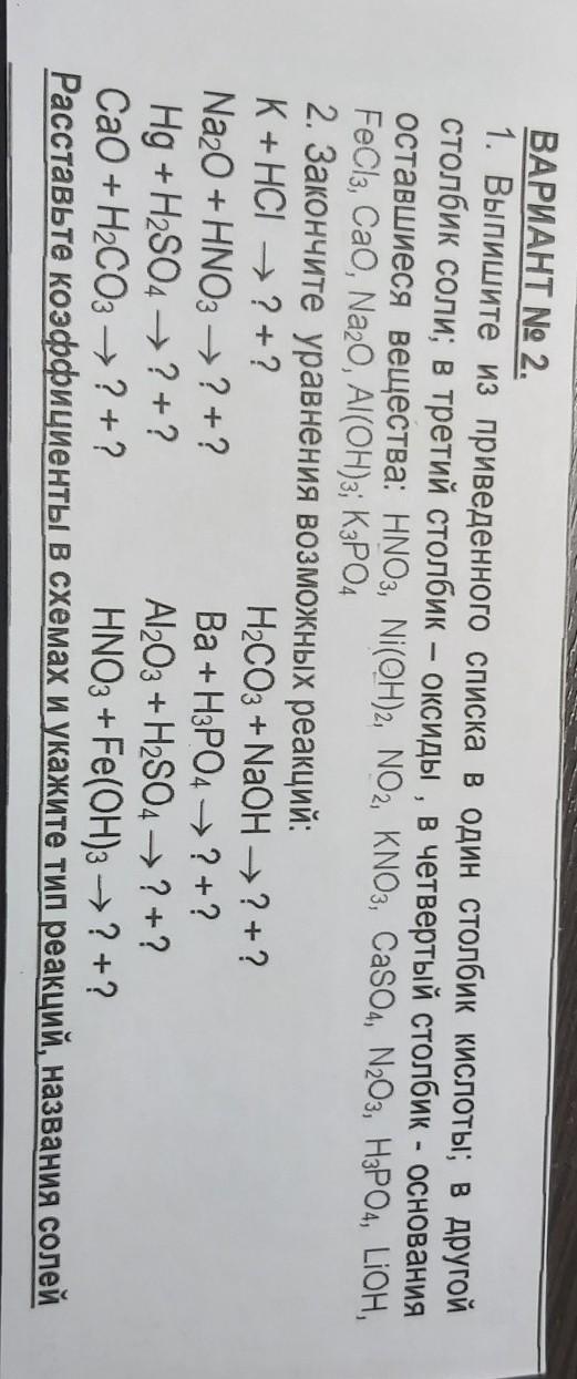 Задание 1). Килоты: HNO3, H3PO4. Соли: KNO3, CaSO4, FeCl3, K3PO4. Оксиды: NO2, N2O3, CaO, Na2O. Основания: Ni(OH)2,Al(OH)3.
