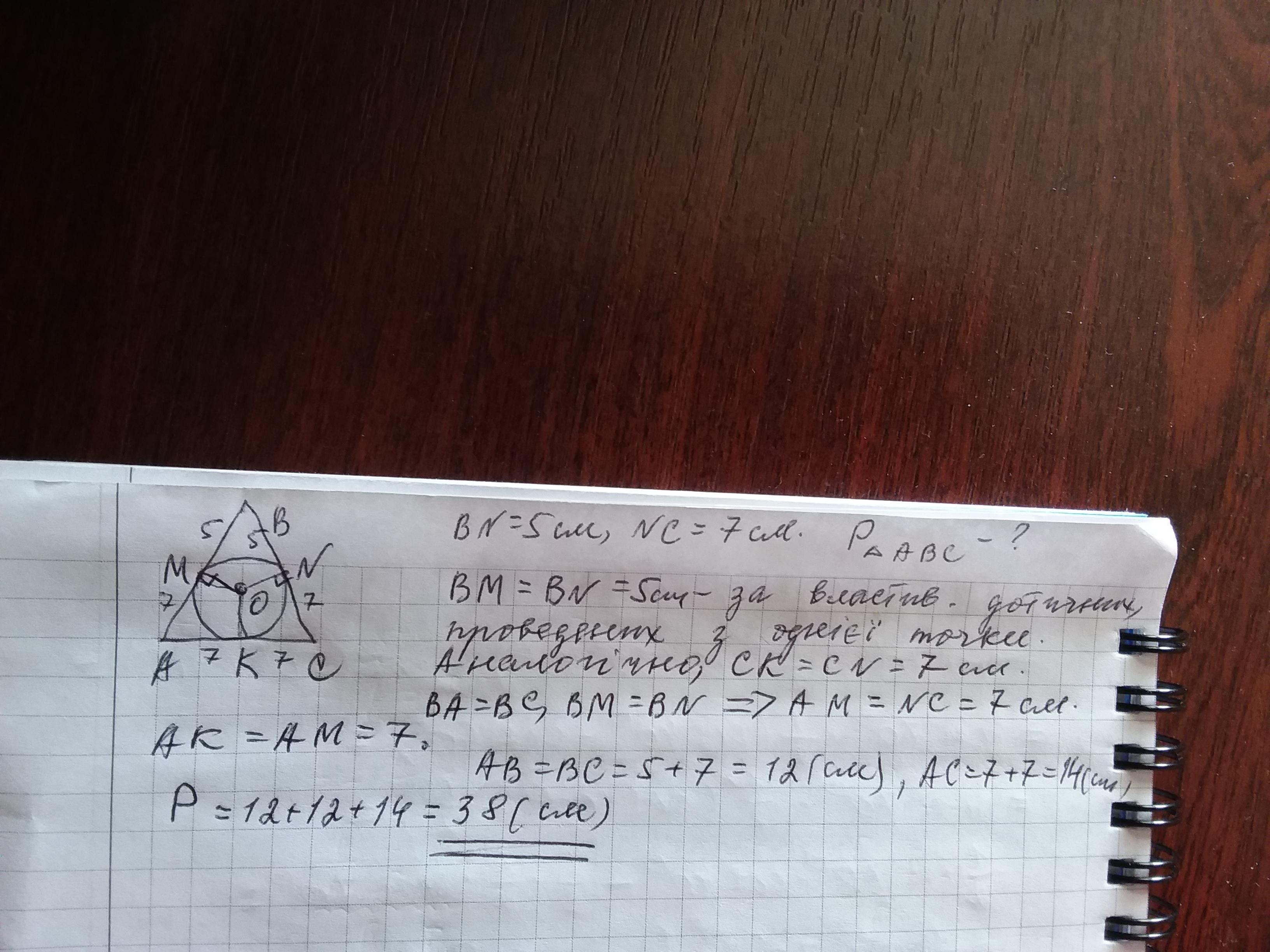 Кол, вписане у рівнобедрений трикутник, ділить його бічну сторону на відрізки 5 см і 7 см починаючи від вершини протилежної основі. Знайдіть периметр трикутника.