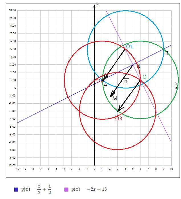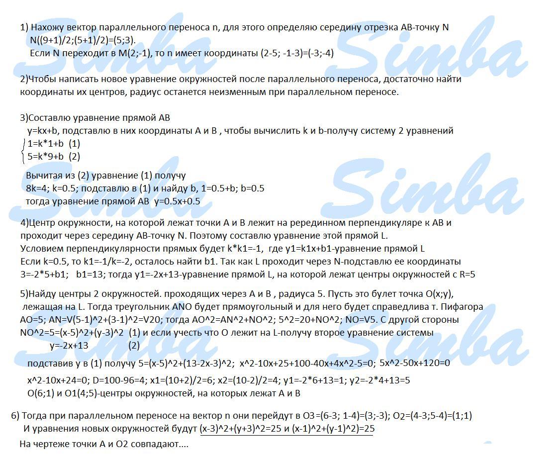 Точки А(1;1) i B(9; 5) належить колу, радіус якого 5 см. Після паралельного перенесення середина хорди АВ переміщується в точку М(2; -1). Записати рівняння кола після паралельного перенесення.