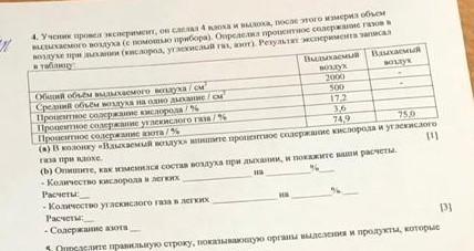 ученик провёл эксперимент он сделал 4 вдоха и выдоха после этого он измерил объём выдыхаемого воздуха Определите процентное содержание газов в воздухе при дыхании(кислород углекислый газ азот) результат эксперимента записал в таблицу