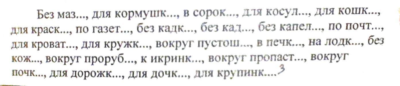 Без мазИ, для кормушкИ, в сорокЕ, для косулИ, для кошкИ, для краскИ, по газетЕ, без кадкИ, без капелИ, по почтЕ, для кроватИ, для кружкИ, вокруг пустошИ, в печкЕ, на ложкЕ, без кожИ, вокруг пропубИ, к икринкЕ, вокруг пропастИ, вокруг почкИ, для дорожкИ, для дочкИ, для крупинкИ.