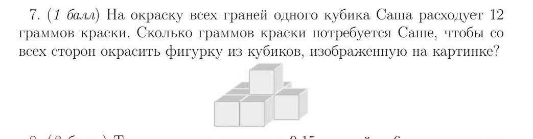 На окраску всех граней одного кубика Саша расходует 12 граммов краски. Сколько граммов краски потребуется Саше, чтобы со всех сторон окрасить фигурку из кубиков, изображенную на картинке?
