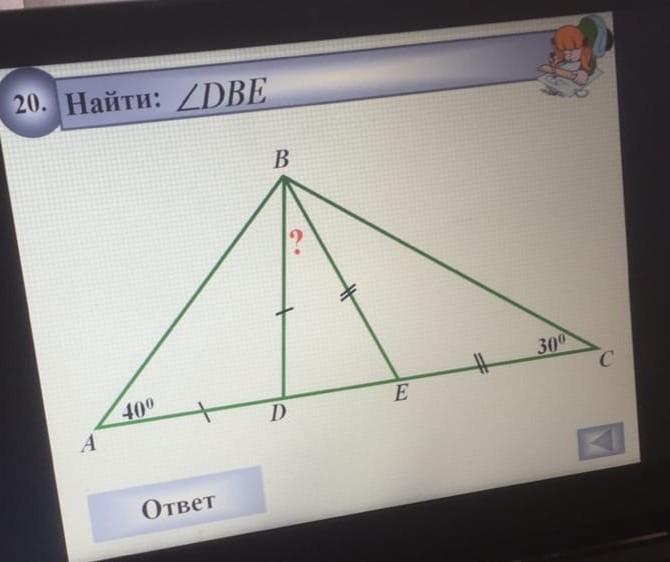 Поскольку треугольник АБД равнобокий, то угол БАД будет ровен АДБ = 40 градусов. Так же с треугольником БЕЦ, угол ЦБЕ равен 30. Значит угол АДБ = 180-40*2=100, а угол БЕД = 180-30*2=120. Следовательно углы БДЕ И БЕД равны 80 и 60 градусам соответственно. Угол ДБЕ = 180-80-60=40