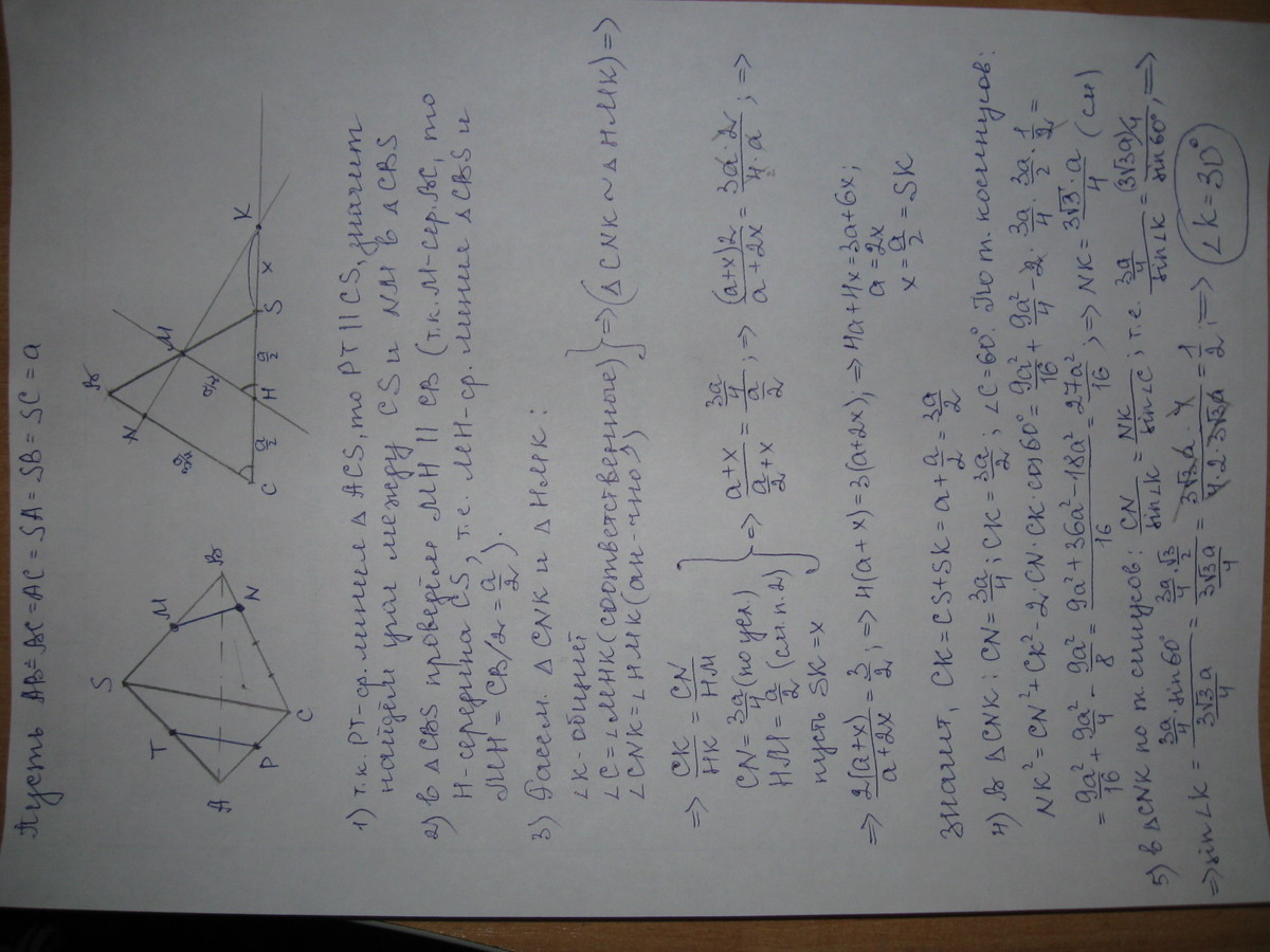Sabc-правильный тетраэдр.точки Р,Т и М-середины ребер АС, AS и SB соответственно, точка N принадлежит ребру ВС так, что BN:NC=1:3.Найдите угол между прямыми TP и MN в градусах.