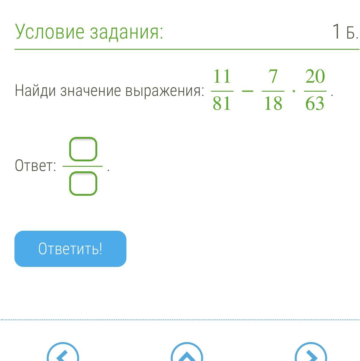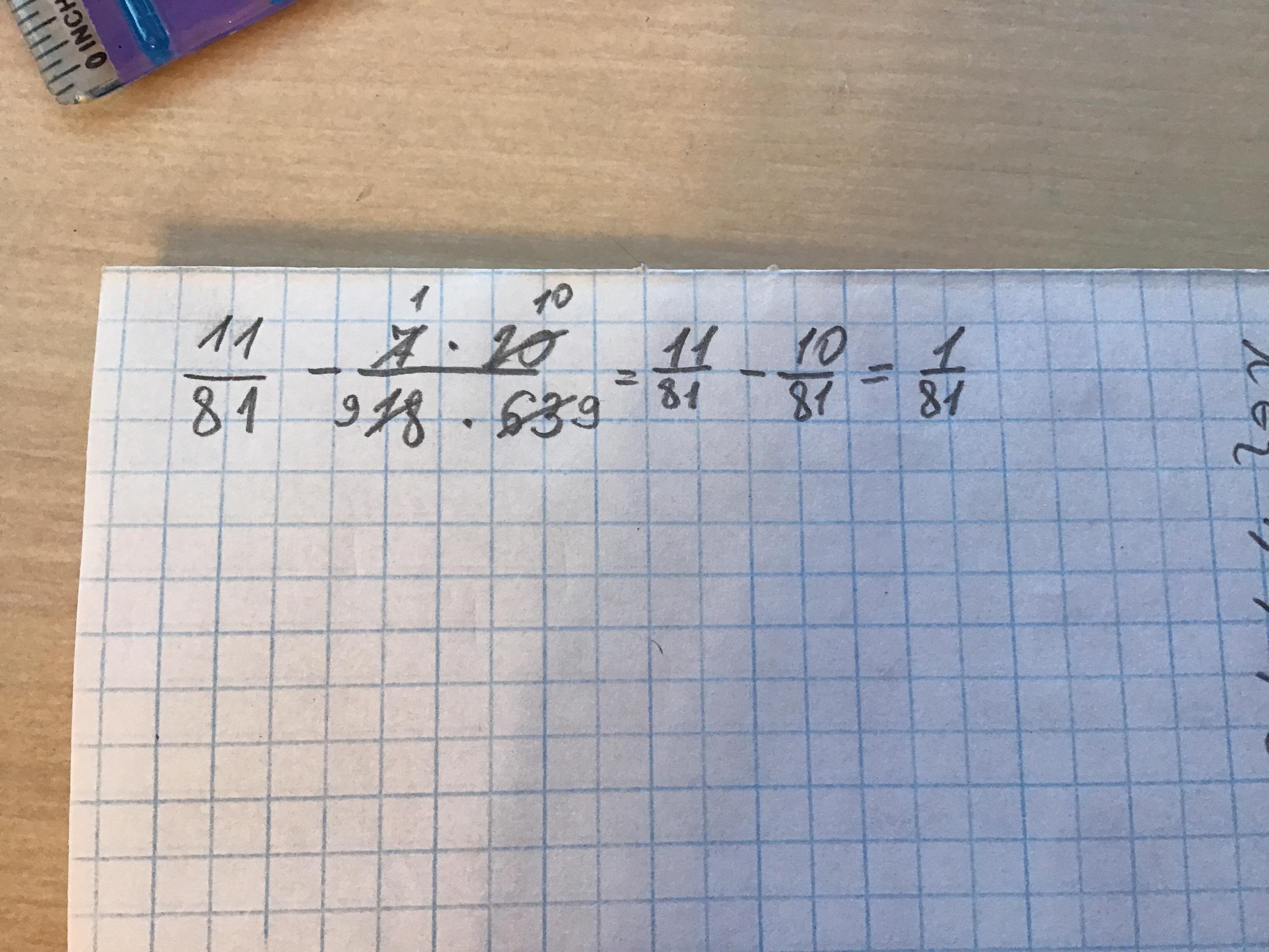 11/81 - 7/18 * 20/63 = 11/81 - 1/9 * 10/9 = 11/81 - 10/81 = 1/81