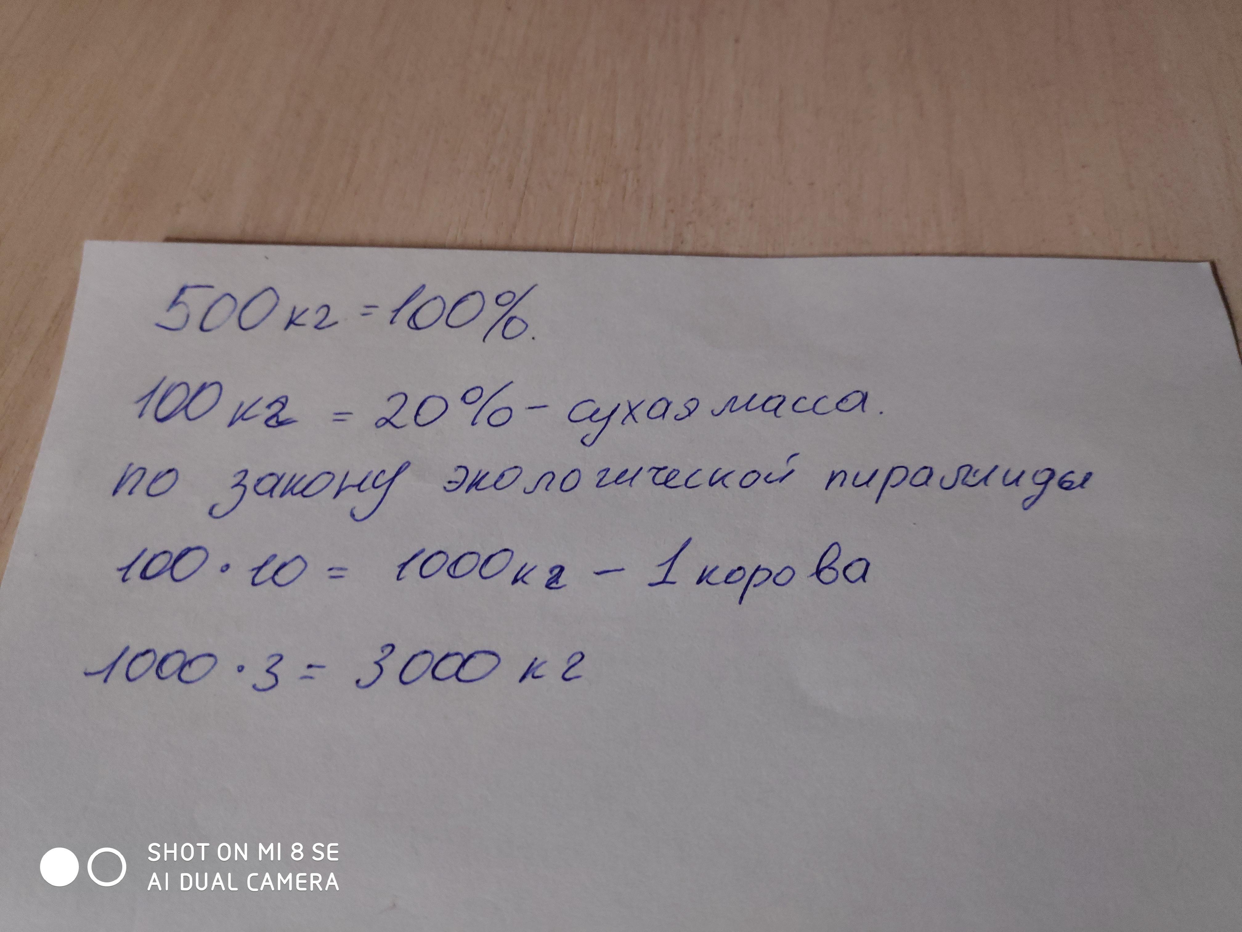 На 1 га луга могут прокормиться 3 коровы. Одна корова весит 500 кг. Какое количество растительной биомассы употребляют коровы, если вода составляет 80% от массы тела коровы?