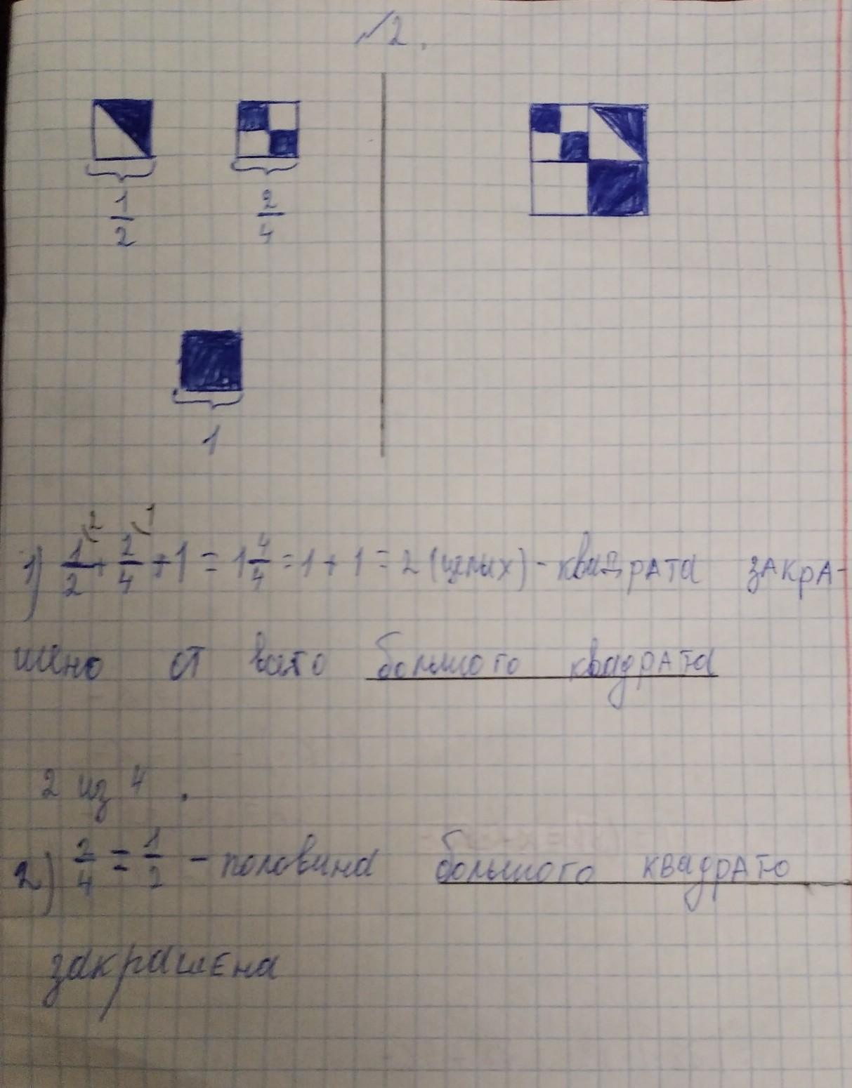 Большой квадрат состоит из 4 маленьких квадратиков,поэтому сначало определим,какая доля закрашена в каждом маленьком квадратике .Далее сложим все получившиеся части ,из которых получилось 2 маленьких квадратика ( на фото ) . Весь квадрат состоит из 4 маленьких квадратиков,а 2(при сложении всех частиц) закрашено.Тогда,можно сказать,что закрашено 2/4 большого квадрата ,или же 1/2 большого квадрата.