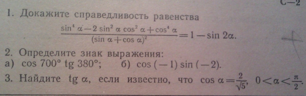 1); frac{sin^4a-2sin^2acos^2a+cos^4a}{(sina+cosa)^2}=frac{(sin^2a-cos^2a)^2}{sin^2a+2sinacosa+cos^2a}=frac{(-cos2a)^2}{1+2sinacosa}=\\=frac{cos^22a}{1+sin2a}=frac{1-sin^22a}{1+sin2a}=frac{(1-sin2a)(1+sin2a)}{1+sin2a}=1-sin2a\2)\ cos700tg380=cos(720-20)tg(360+20)=cos20tg20>0,; \t.k.cos20>0,tg20>0\\cos(-1)>0,t.k.; (-1); radianin 4; chetverti\sin(-2)<0,; (-2); radianain 3; chetverti\\cos(-1)sin(-2)<0\\3); Formyla:; 1+tg^2a=frac{1}{cos^2a}; to ; tg^2a=1-frac{1}{cos^2a}