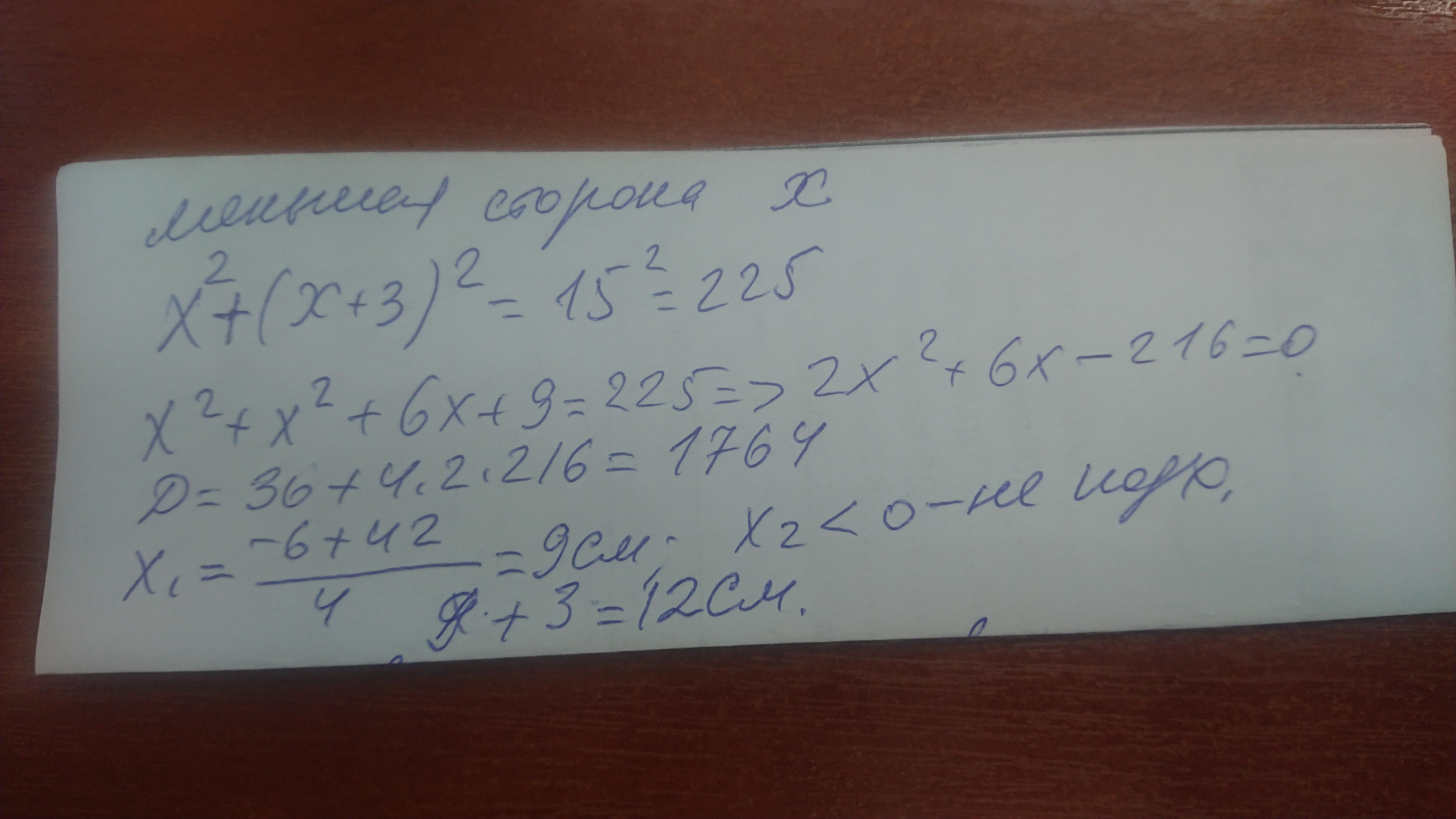 Найдите стороны прямоугольника если одна из них на 3 см меньше другой а диагональ прямоугольника равна 15 см