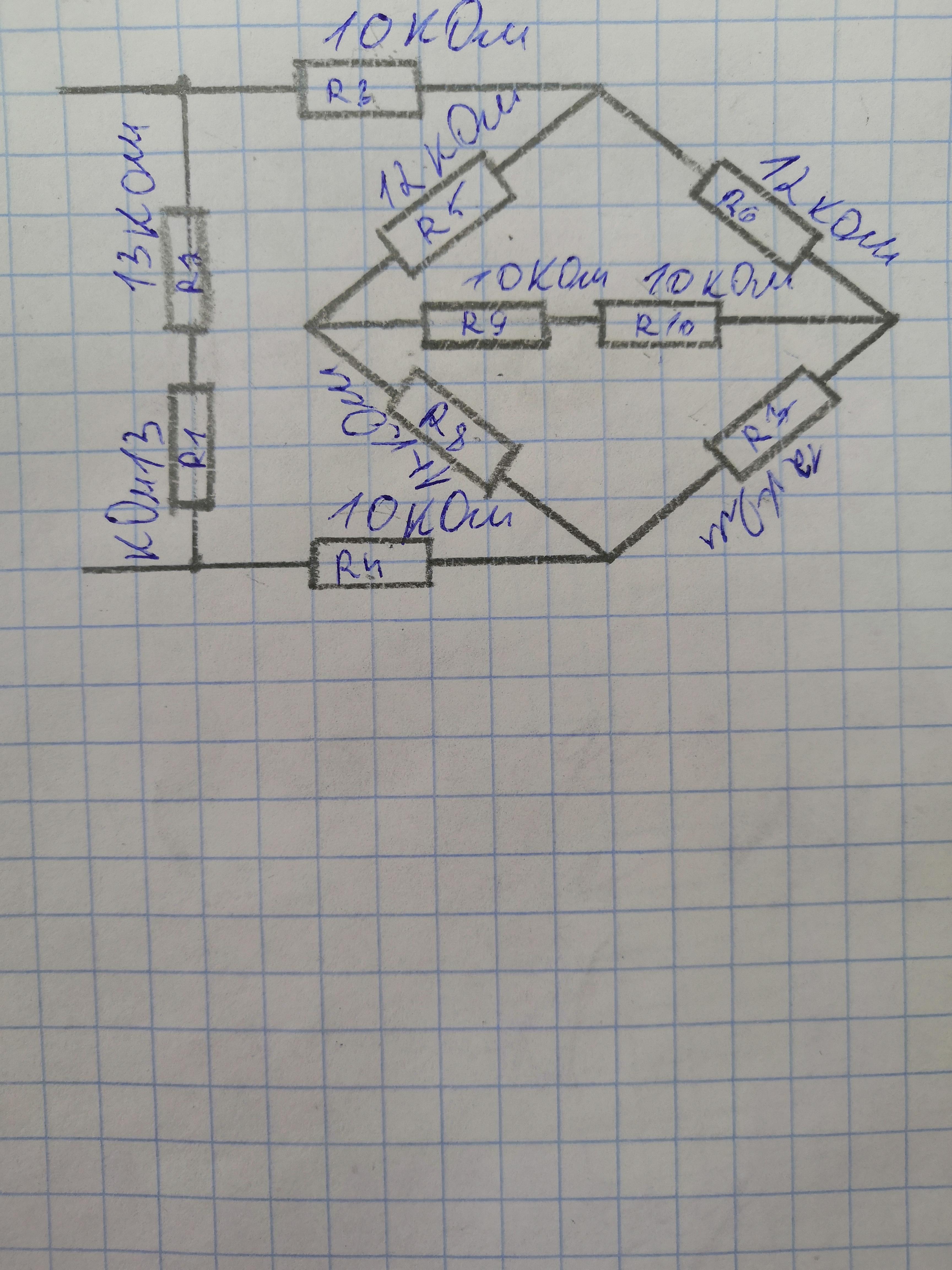 В силу симметрии схемы ток через резисторы 9 и 10 не идет