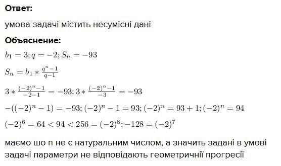 Знайдіть кількість членів скінченної геометричної прогресії (bn), якщо b1 = 3, q = −2, а сума всіх членів Sn = −93.