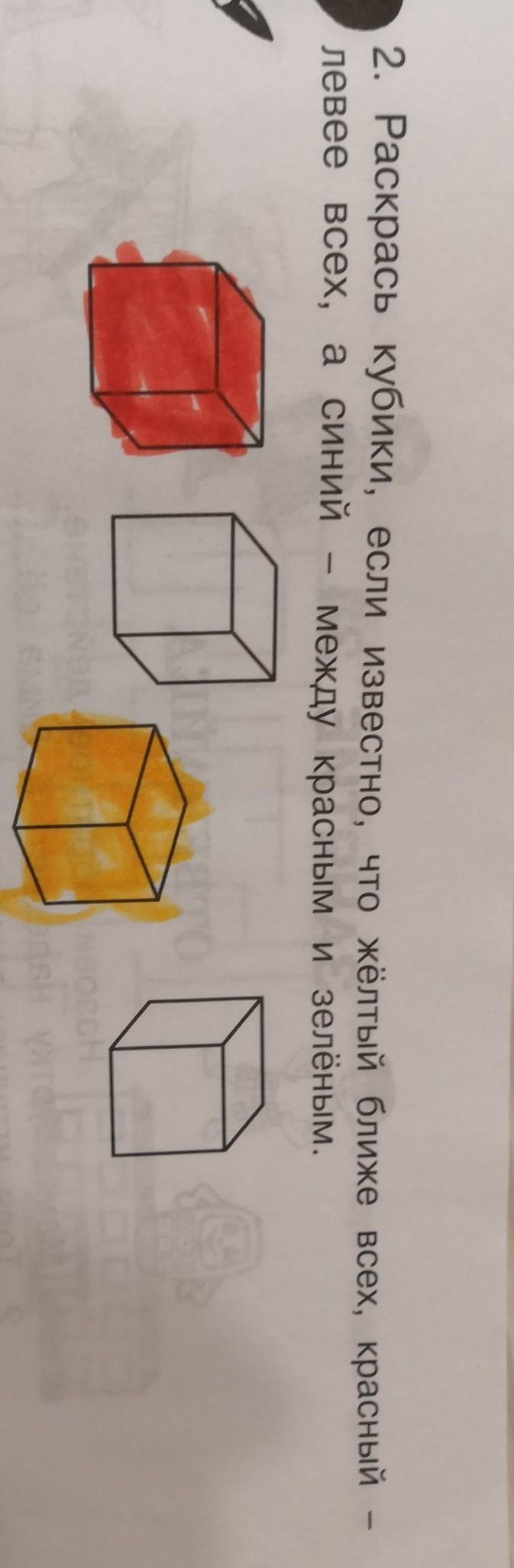2. Раскрась кубики, если известно, что жёлтый ближе всех, красный -
