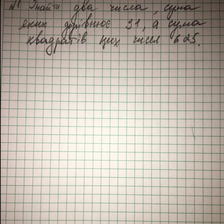 X-первое число. Y-второе число. X+Y=31. X^2+Y^2=625. (X+Y) ^2-X^2-Y^2=961-625=336=2XY.=>XY=168.
