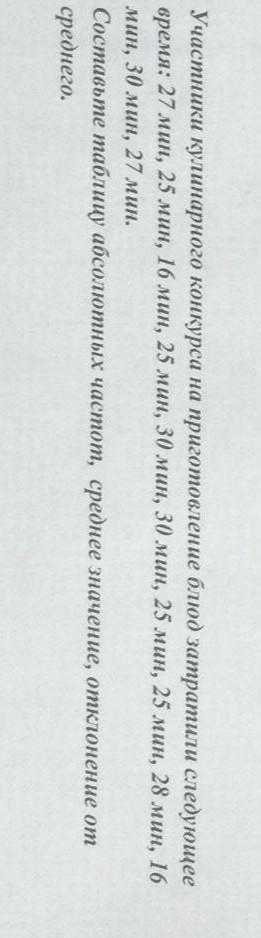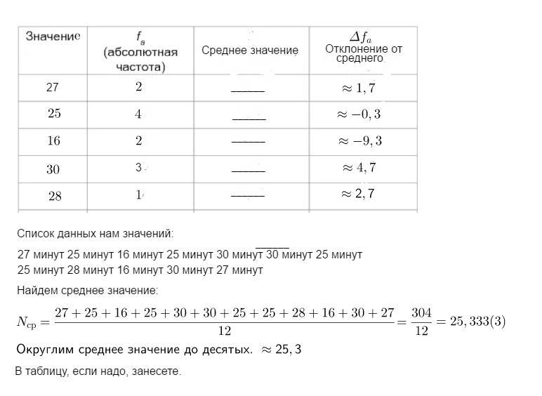 участники кулинарного конкурса на приготовление блюд затратили следующие следующие время 27 минут 25 минут 16 минут 25 минут 30 минут 30 минут 25 минут 25 минут 28 минут 16 минут 30 минут 27 минут составьте таблицу абсолютных частот среднее значение отклонения от среднего