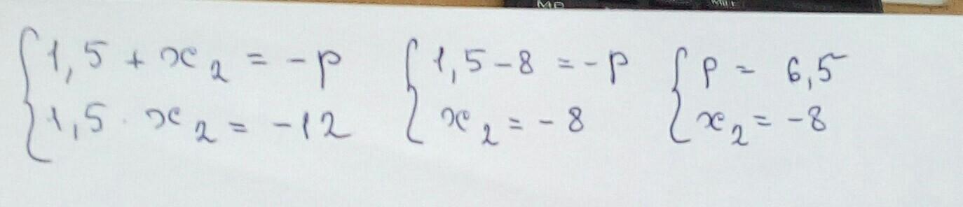 Один з кореннів рівняння х^2+px-12=0 дорівнює 1,5. Знайдіть коефіціент “p” і другий корень рівняння (теорема віета)