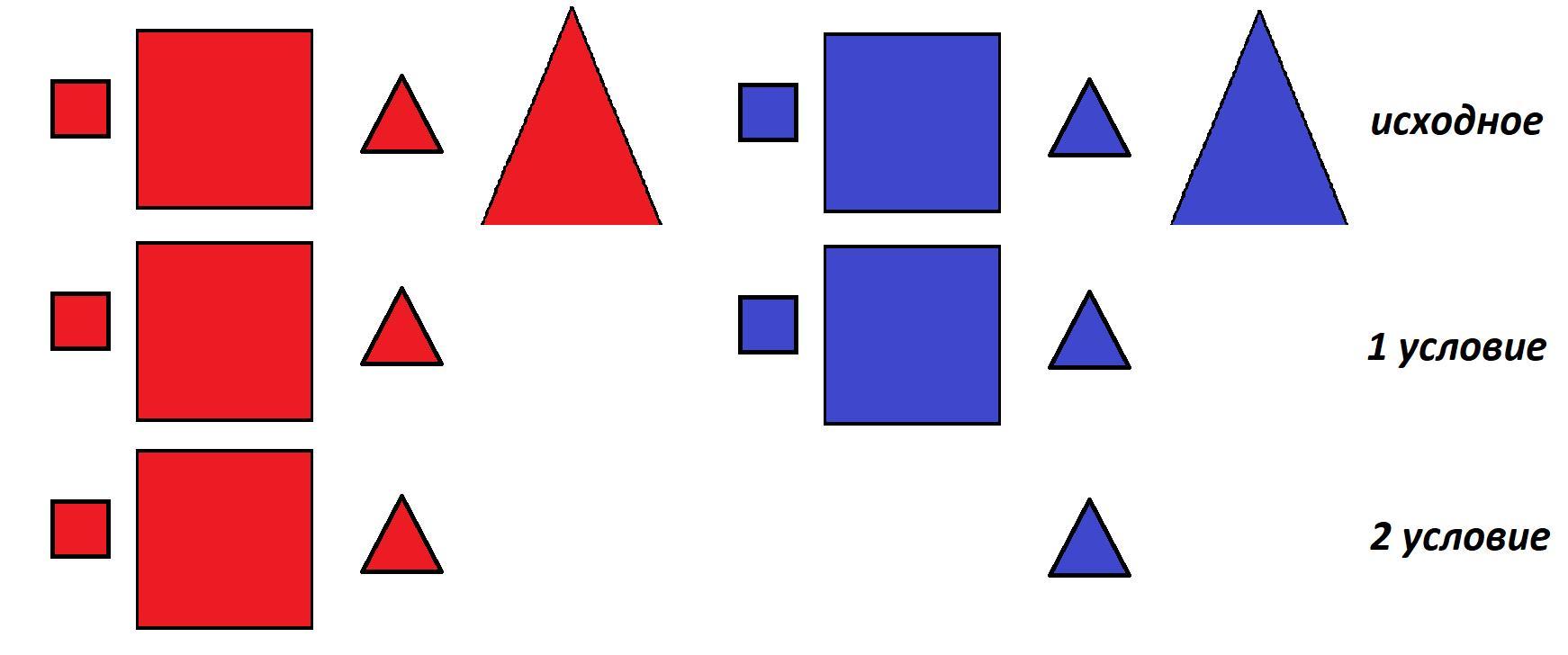 Изобразим все возможные фигуры: квадраты и треугольники, синие и красные, большие и маленькие (картинка).