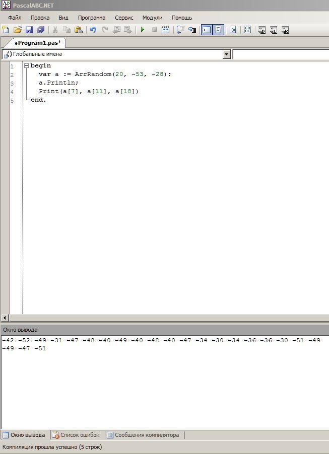 массив из 20 чисел задан датчиком случайных чисел на интервале (-28;-53) вывести на экран 8,12,19 элемент массива