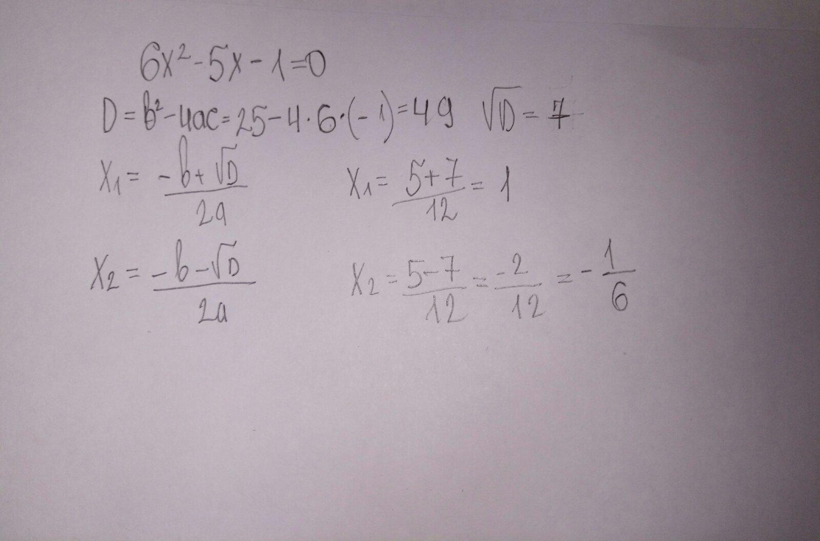 1) 6х2 - 5x - 1 = 0;