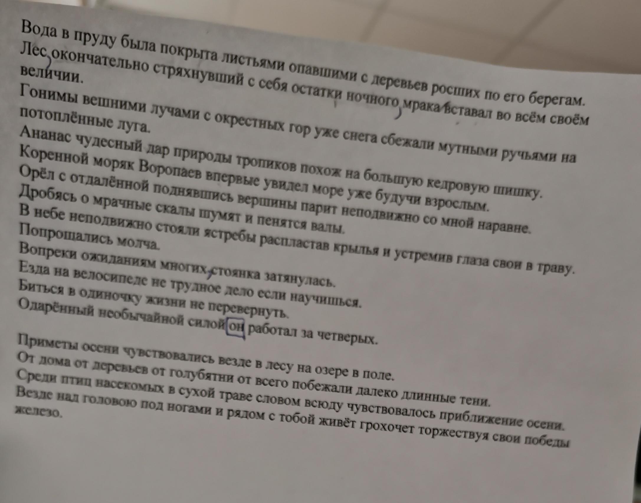 Вода в пруду была покрыта листьями, опавшими с деревьев, росших по его берегам. Лес, окончательно стряхнувший с себя остатки ночного мрака, вставал во всём своём величии. Гонимы вешними лучами с окрестных гор, уже снега сбежали мутными ручьями на потоплённые луга. Ананас, чудесный дар природы тропиков, похож на большую кедровую шишку. Коренной моряк Воропаев впервые увидел море, уже будучи взрослым. Орёл, с отдалённой поднявшись вершины, парит неподвижно со мной наравне. Дробясь о мрачные скалы, шумят и пенятся валы. В небе неподвижно стояли ястребы, распластав крылья и устремив глаза свои в траву. Попрощались молча. Вопреки ожиданиям многих стоянка затянулась. Езда на велосипеде не трудное дело, если научишься. Биться в одиночку — жизни не перевернуть. Одарённый необычайной силой, он работал за четверых.