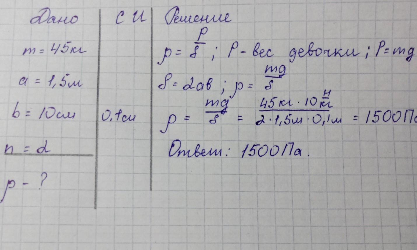 Девочка массой 42 кг стоит на лыжах. Длина каждой лыжи равна 1,5 м, ширина равна 10 см.
