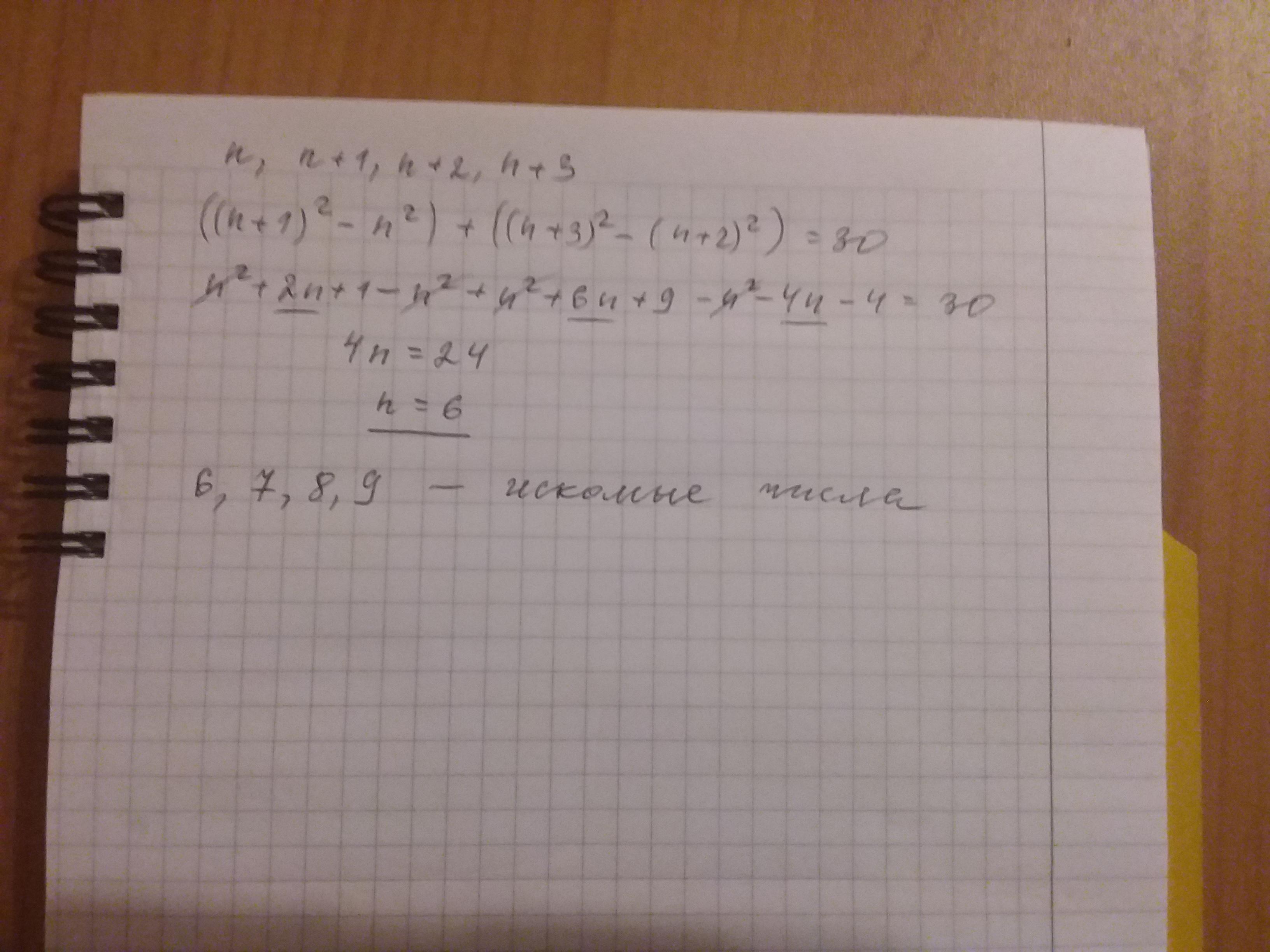 по условию задачи ((n+1)²-n²)+((n+3)²-(n+2)²)=30
