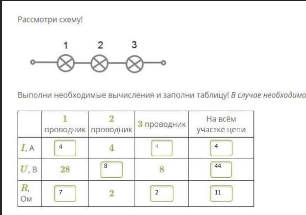 U2=I2*I3=4*2=8В, U=U1+U2+U3=28+8+8=44В- так как это последовательное соединение.