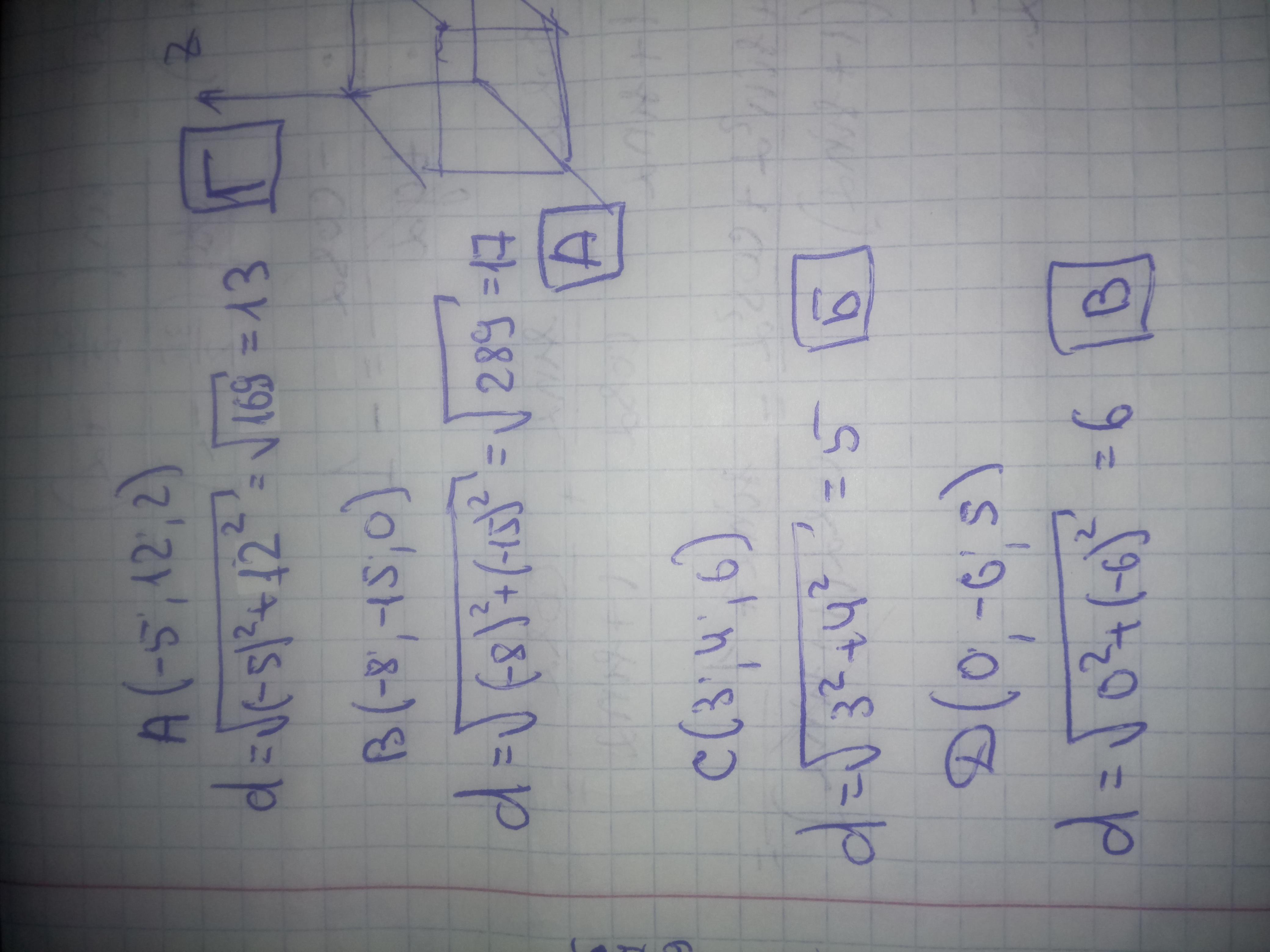 Помогите пожалуйста!!!! Установіть відповідність між точками А(-5;12;2), В(-8;-15;0), С(3;4;6), Д(0;-6;5) і їх відстанню до осі оплікат